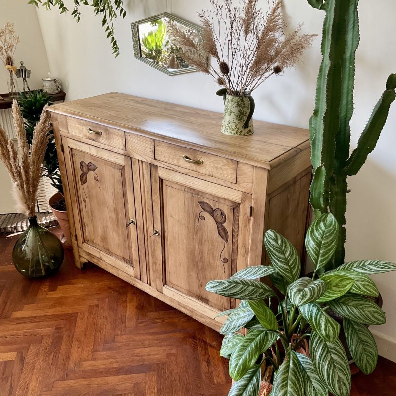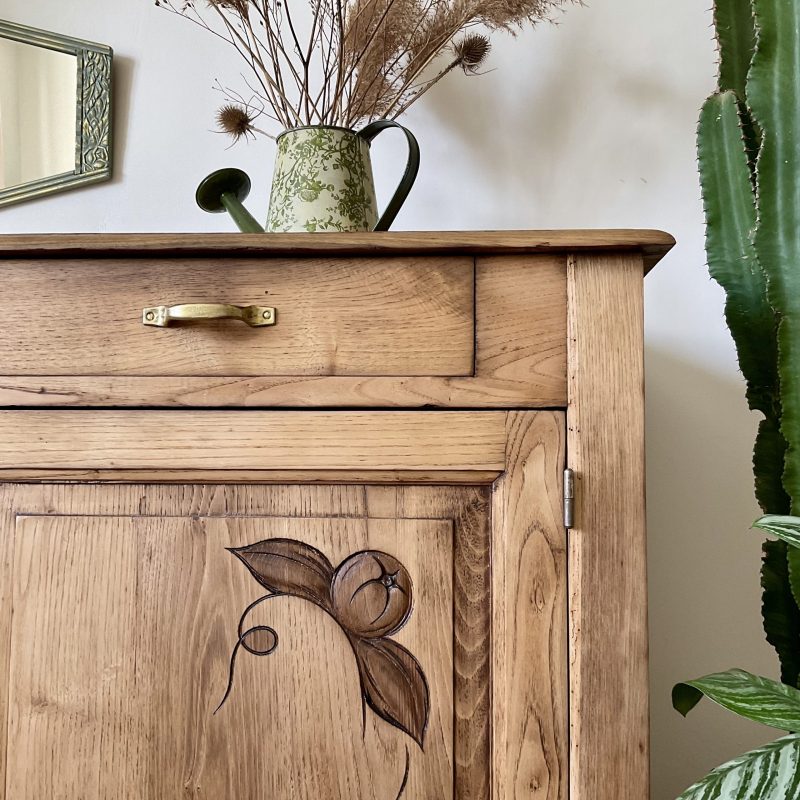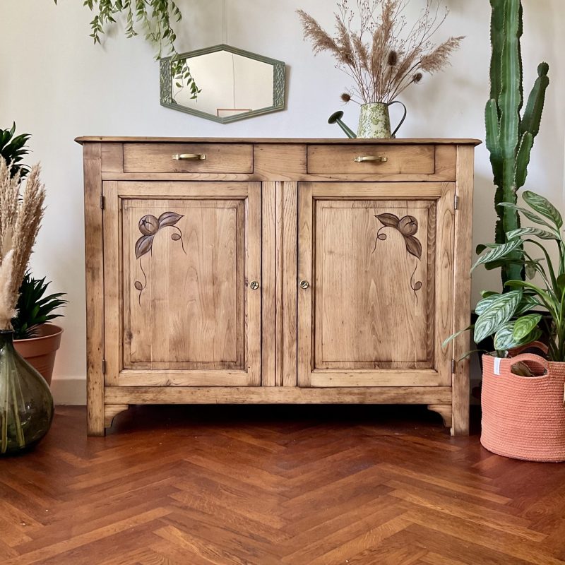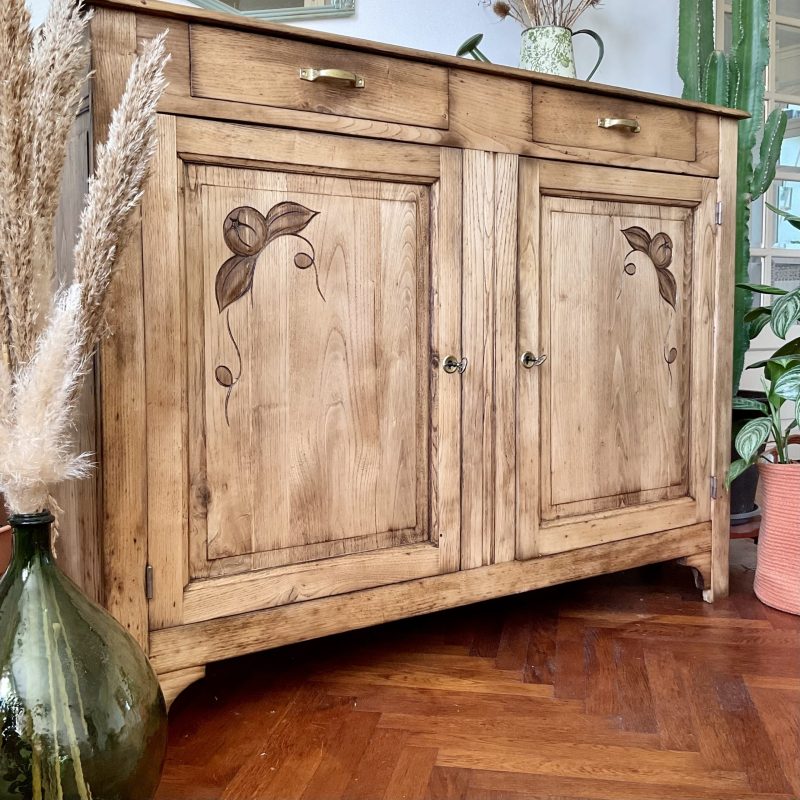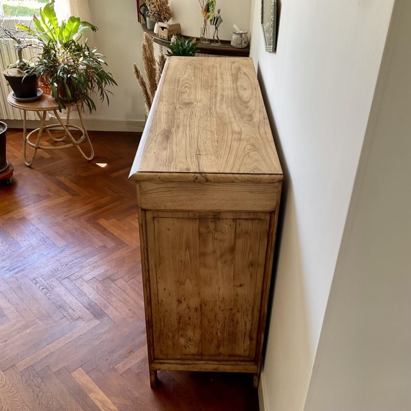 ✨ Et dire que j’ai hésité à peindre l’extérieur de ce buffet en châtaignier massif ! Je ne regrette pas mon choix de le laisser brut (protégé par un vernis mat incolore qui sait se faire oublier). Un très beau bois qui donne à ce meuble une personnalité unique. De discrètes traces laissées par le temps témoignent de son histoire singulière. Un meuble qui a une âme, comme on les aime 💚.
