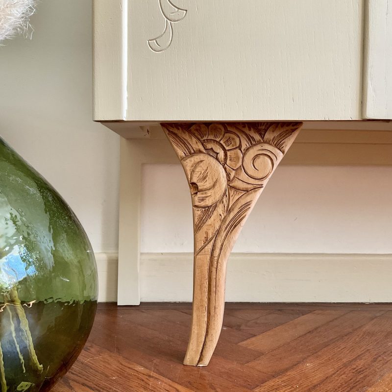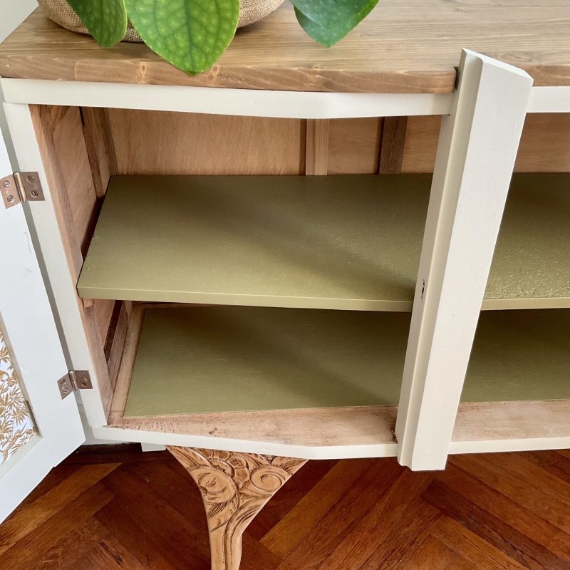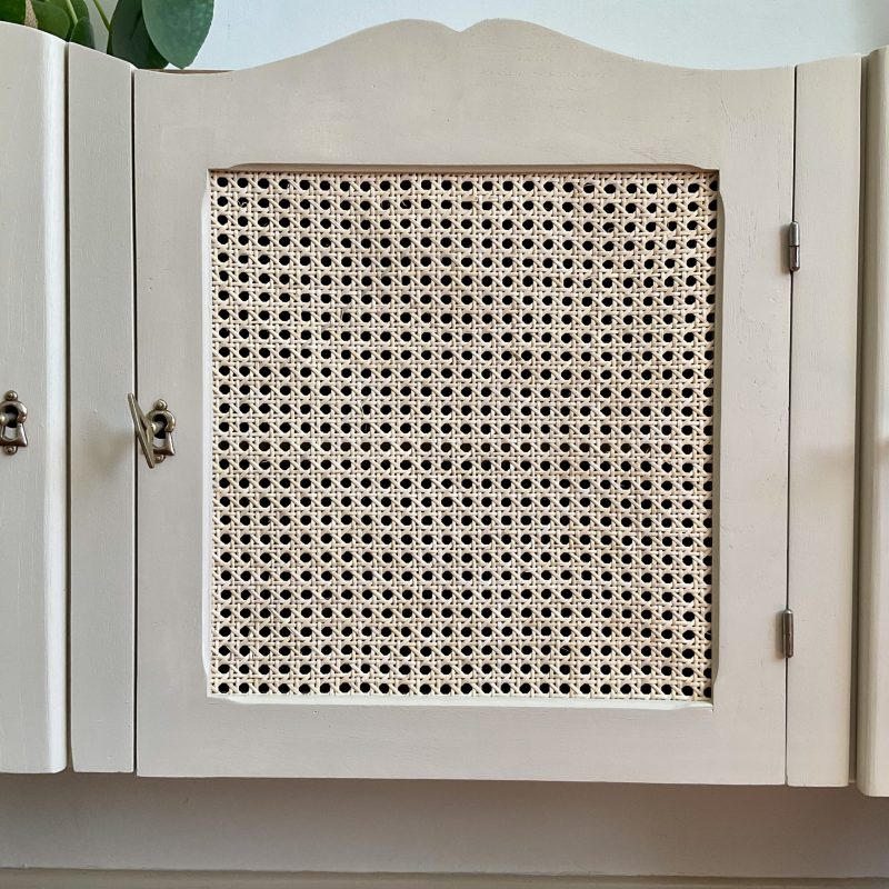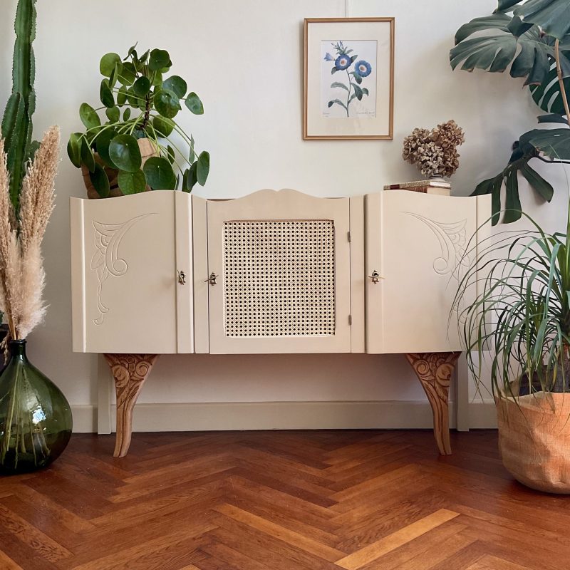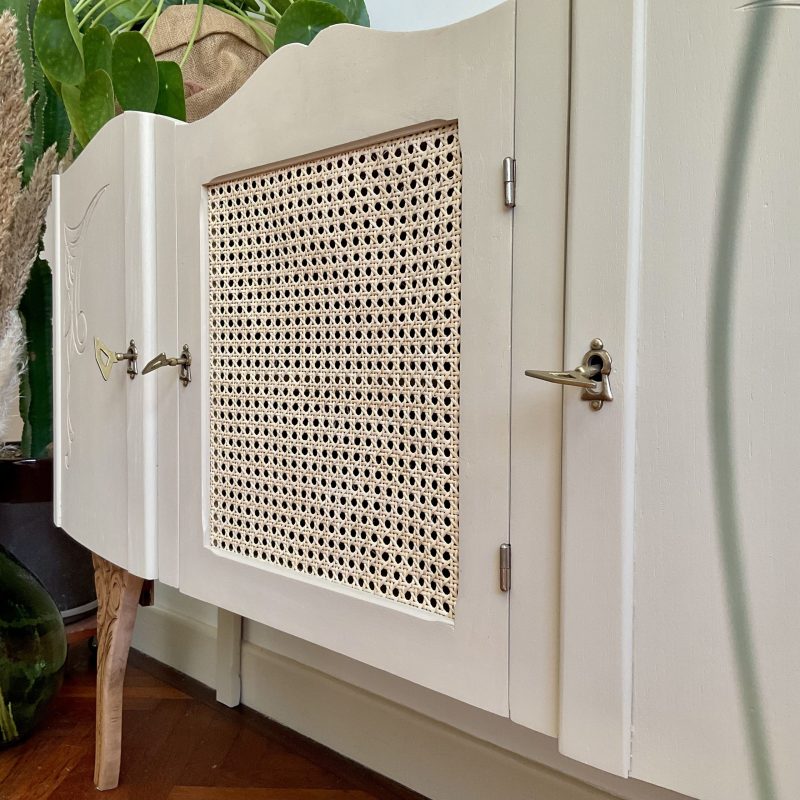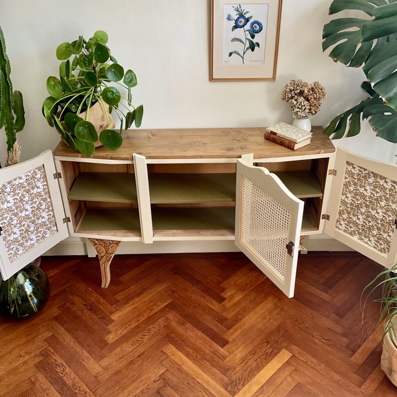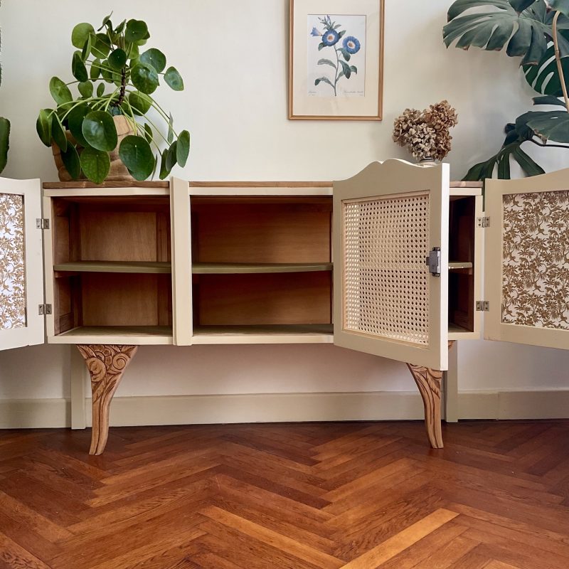 đš RĂ©novĂ© dans un beige dĂ©licat (« String » de chez Farrow and Ball). De jolis motifs floraux ornent les portes latĂ©rales et les pieds. La porte centrale est ornĂ© dâun cannage naturel. LâintĂ©rieur prĂ©sente un vert tendre (« Dibber » toujours chez Farrow and Ball) qui souligne les motifs de lâimprimĂ© encollĂ© Ă lâintĂ©rieur des portes.