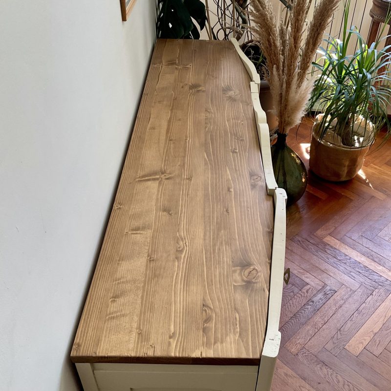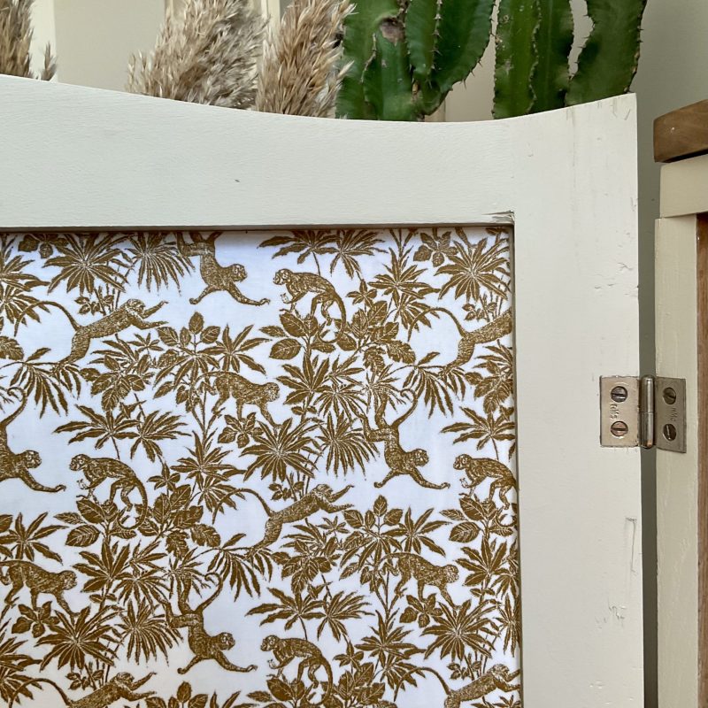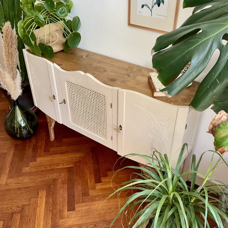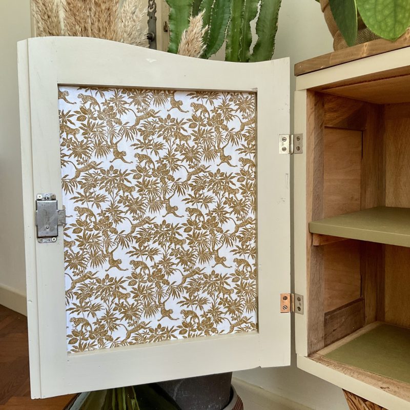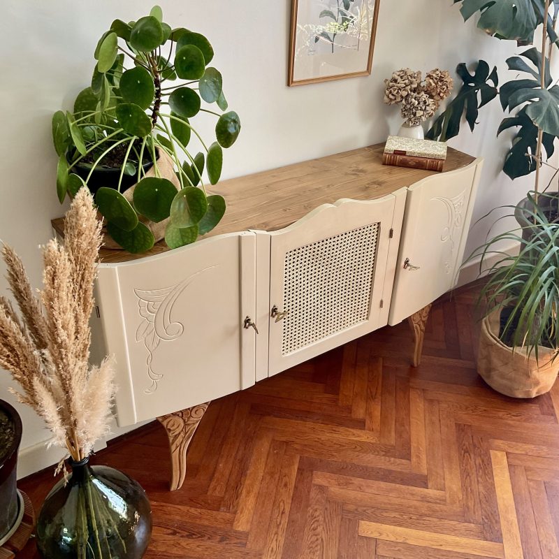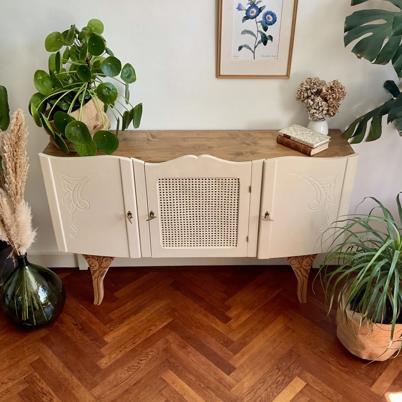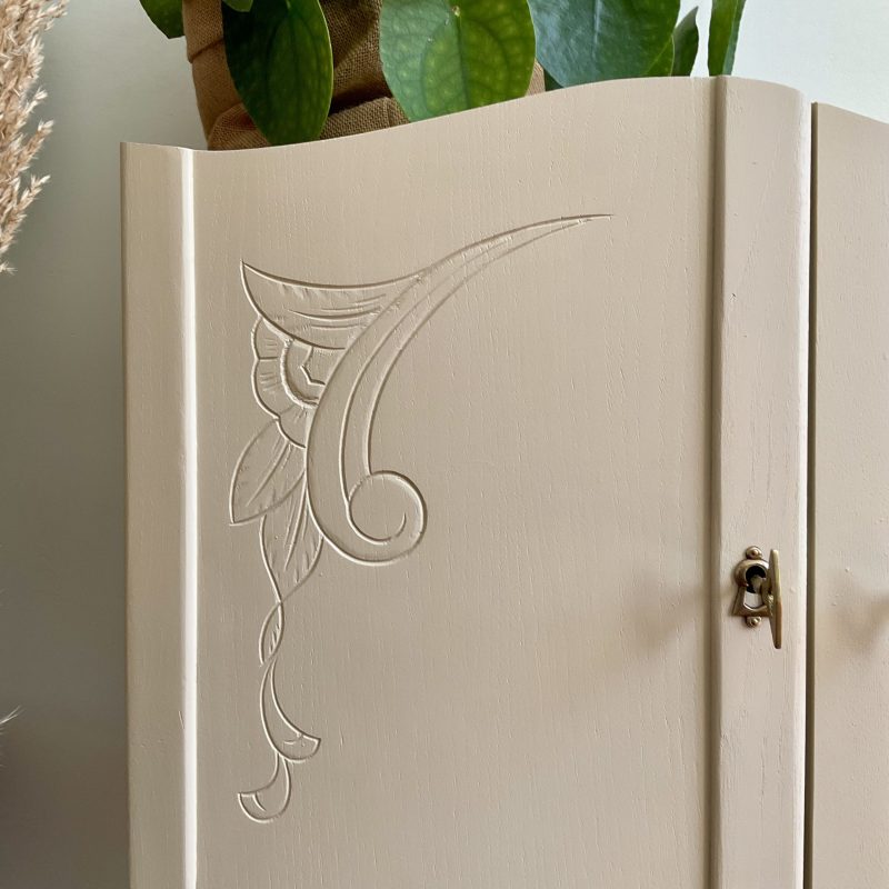 đš RĂ©novĂ© dans un beige dĂ©licat (« String » de chez Farrow and Ball). De jolis motifs floraux ornent les portes latĂ©rales et les pieds. La porte centrale est ornĂ© dâun cannage naturel. LâintĂ©rieur prĂ©sente un vert tendre (« Dibber » toujours chez Farrow and Ball) qui souligne les motifs de lâimprimĂ© encollĂ© Ă lâintĂ©rieur des portes.