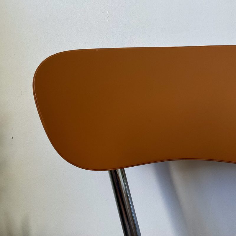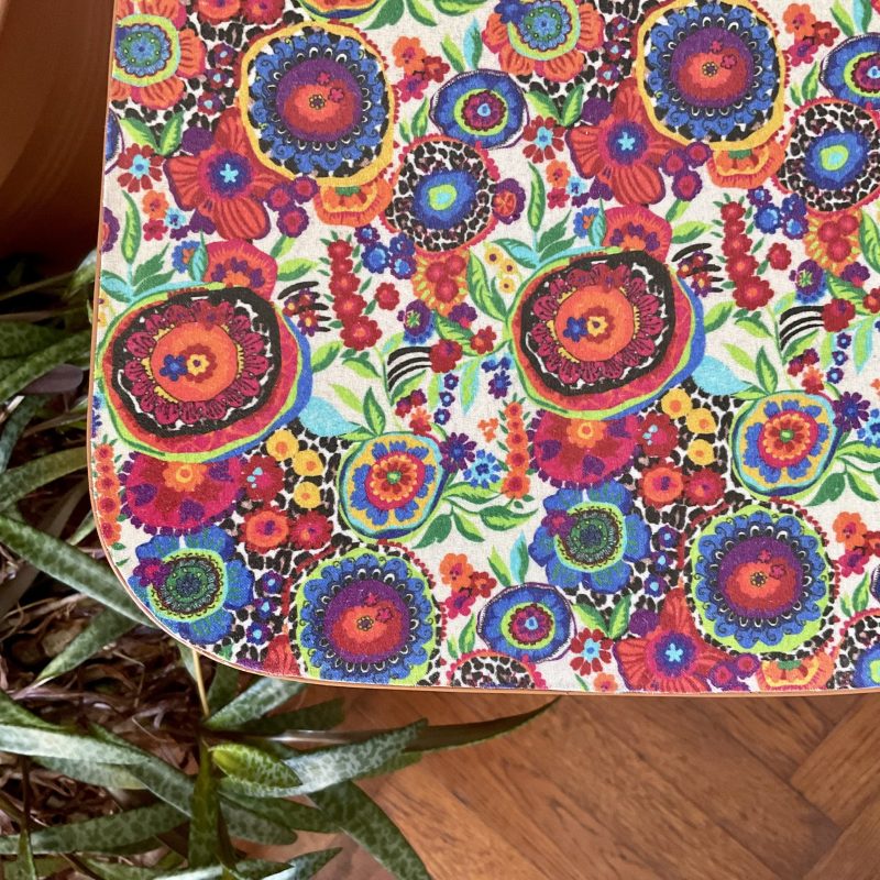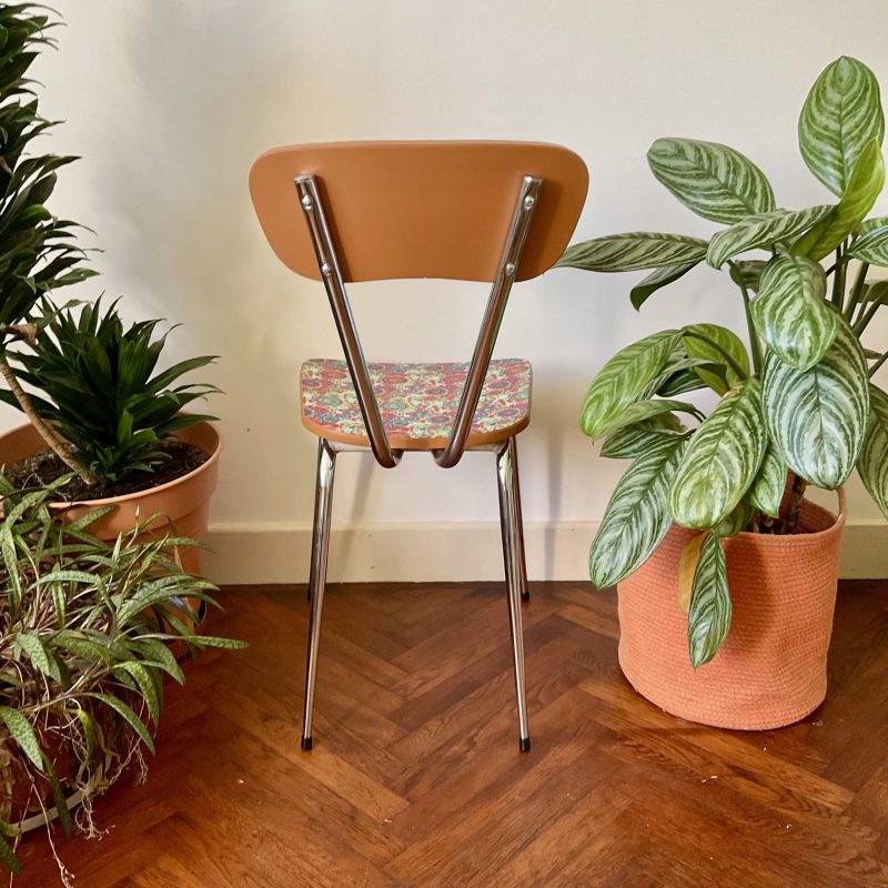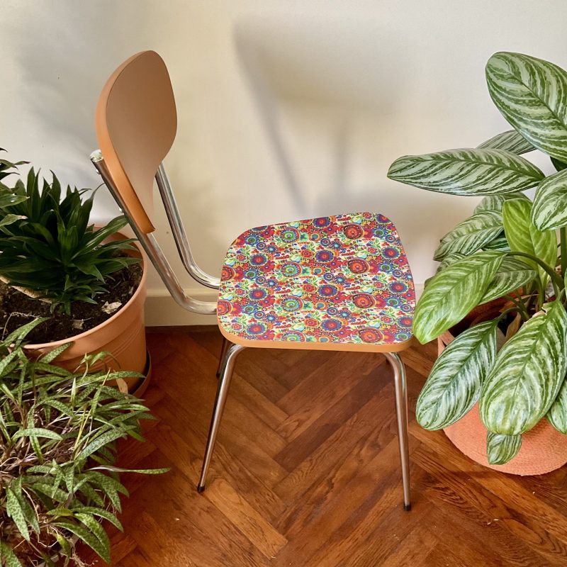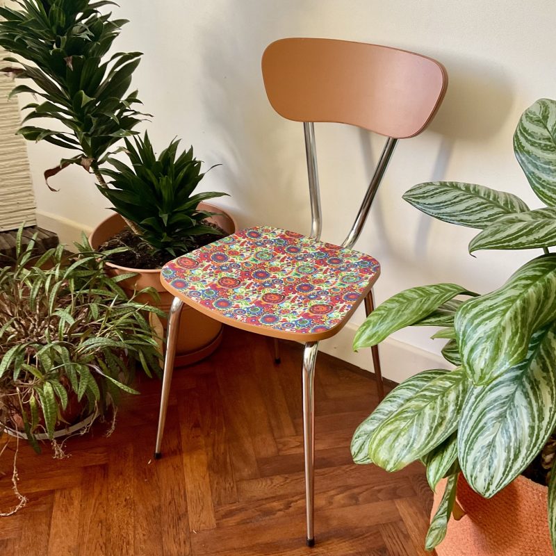 🌸 Chaise vintage en Formica rénovée avec un imprimé vitaminé joliment coloré. Le dossier présente la nuance « Marmelo » de Farrow and Ball, qui souligne les tons chauds de l’assise.