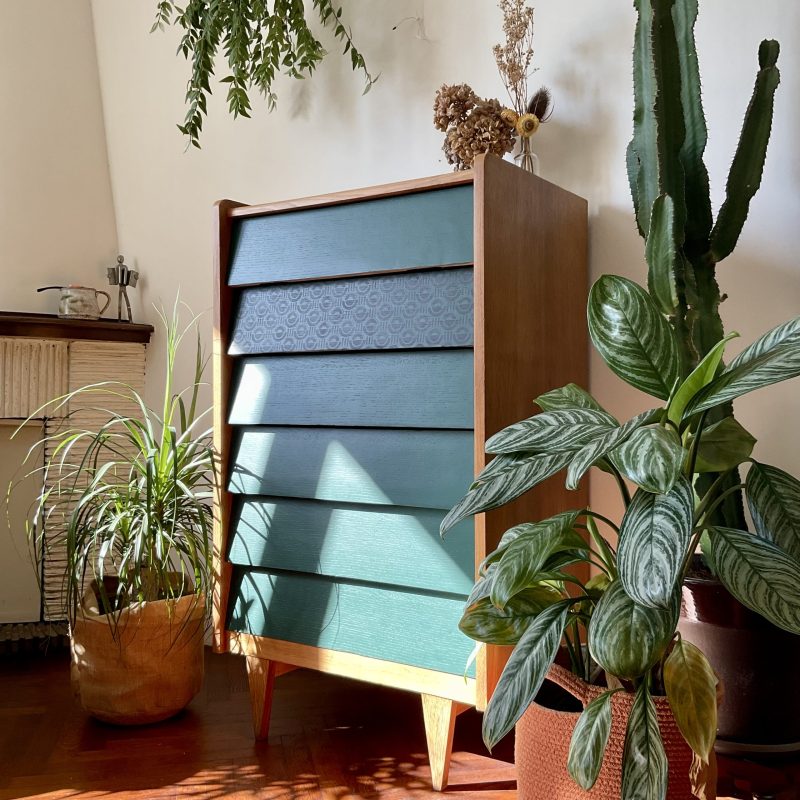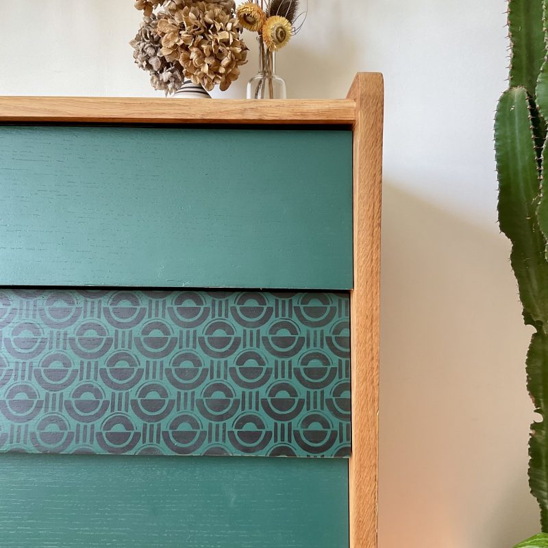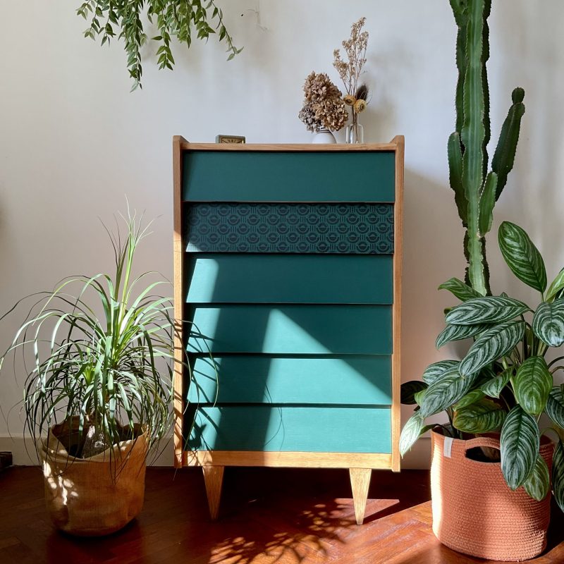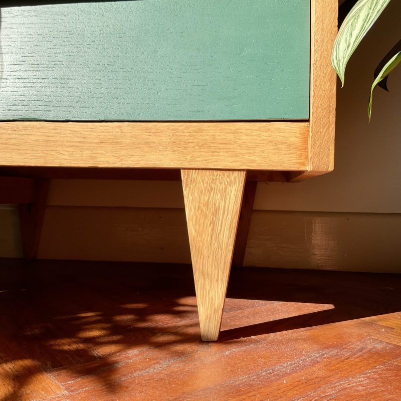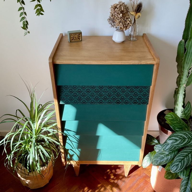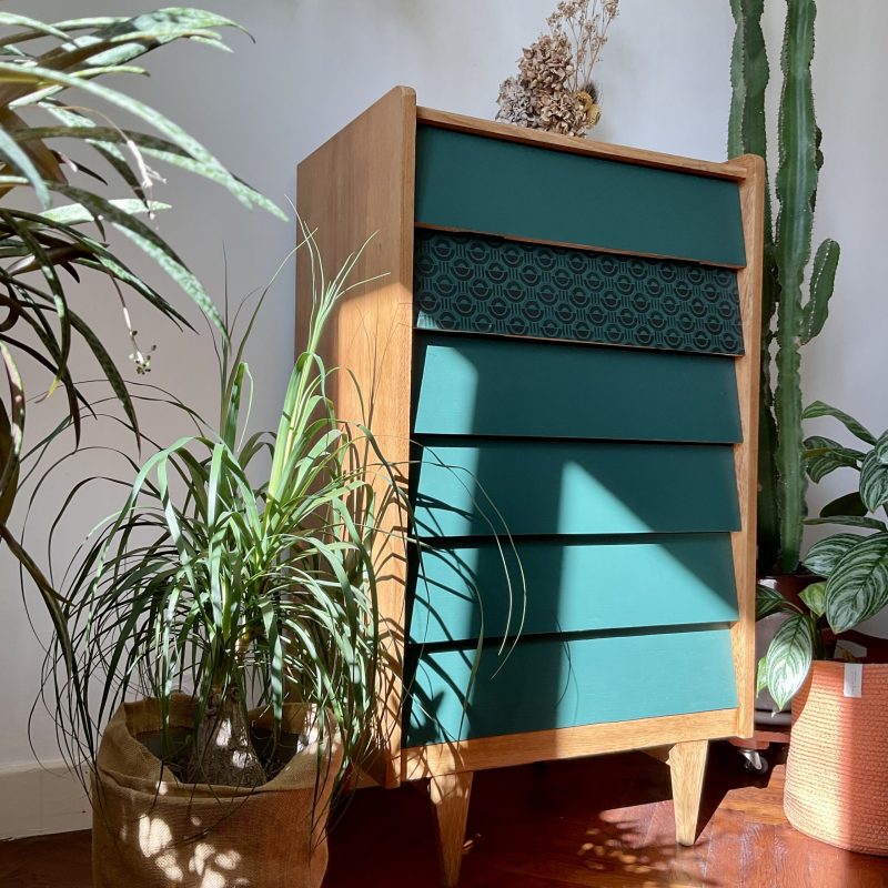 Commode des années 60/70 avec ses jolis pieds fuseau et ses tiroirs en escalier. Les façades des tiroirs sont rénovés dans un profond vert cyprès, qui crée un joli contraste avec la teinte dorée du bois.