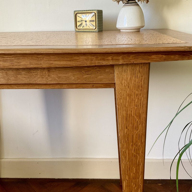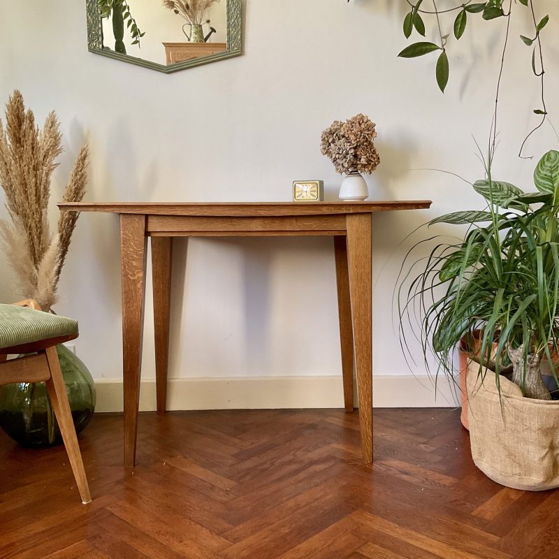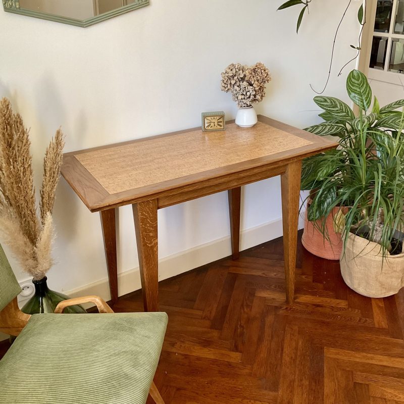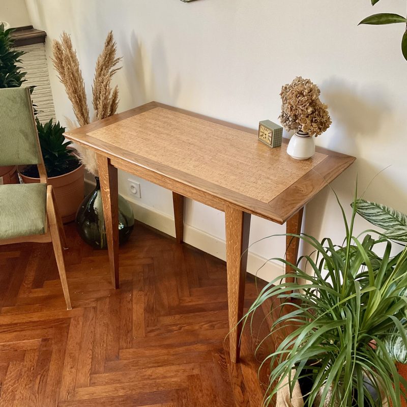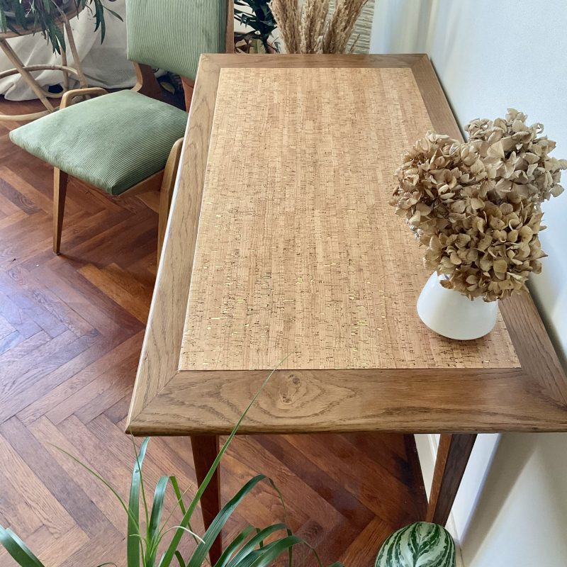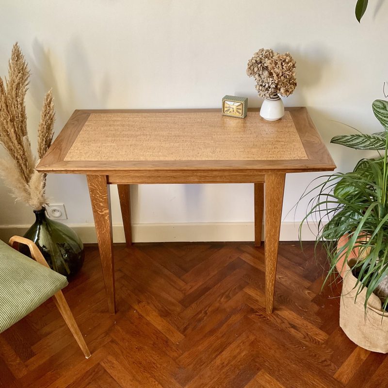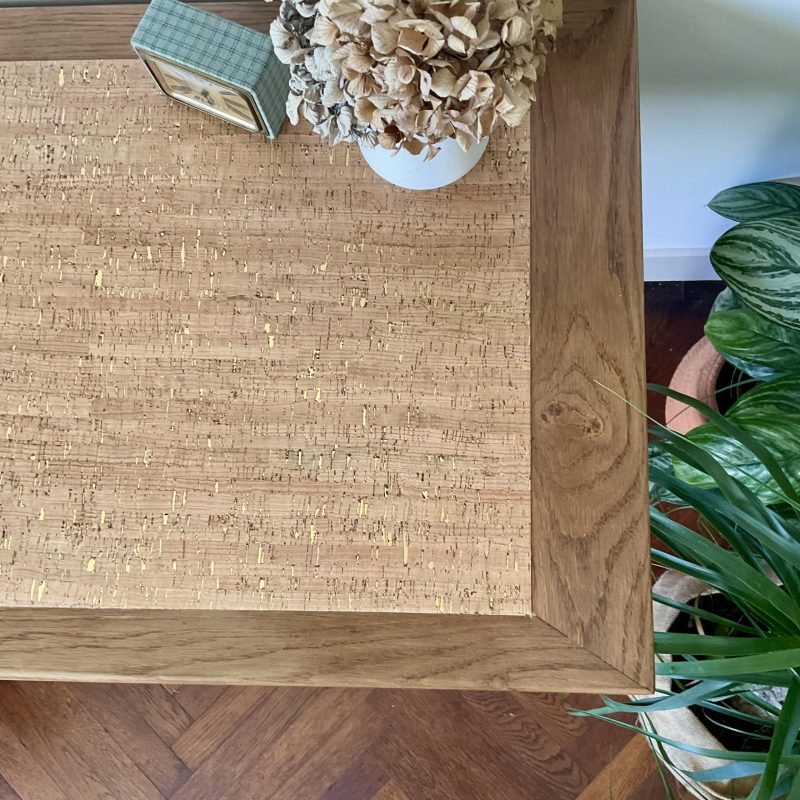 Petite table d’appoint très élégante avec ses pieds compas et son joli bois chaleureux. En chêne massif, le plateau est recouvert de liège subtilement doré, qui apporte une note de raffinement.